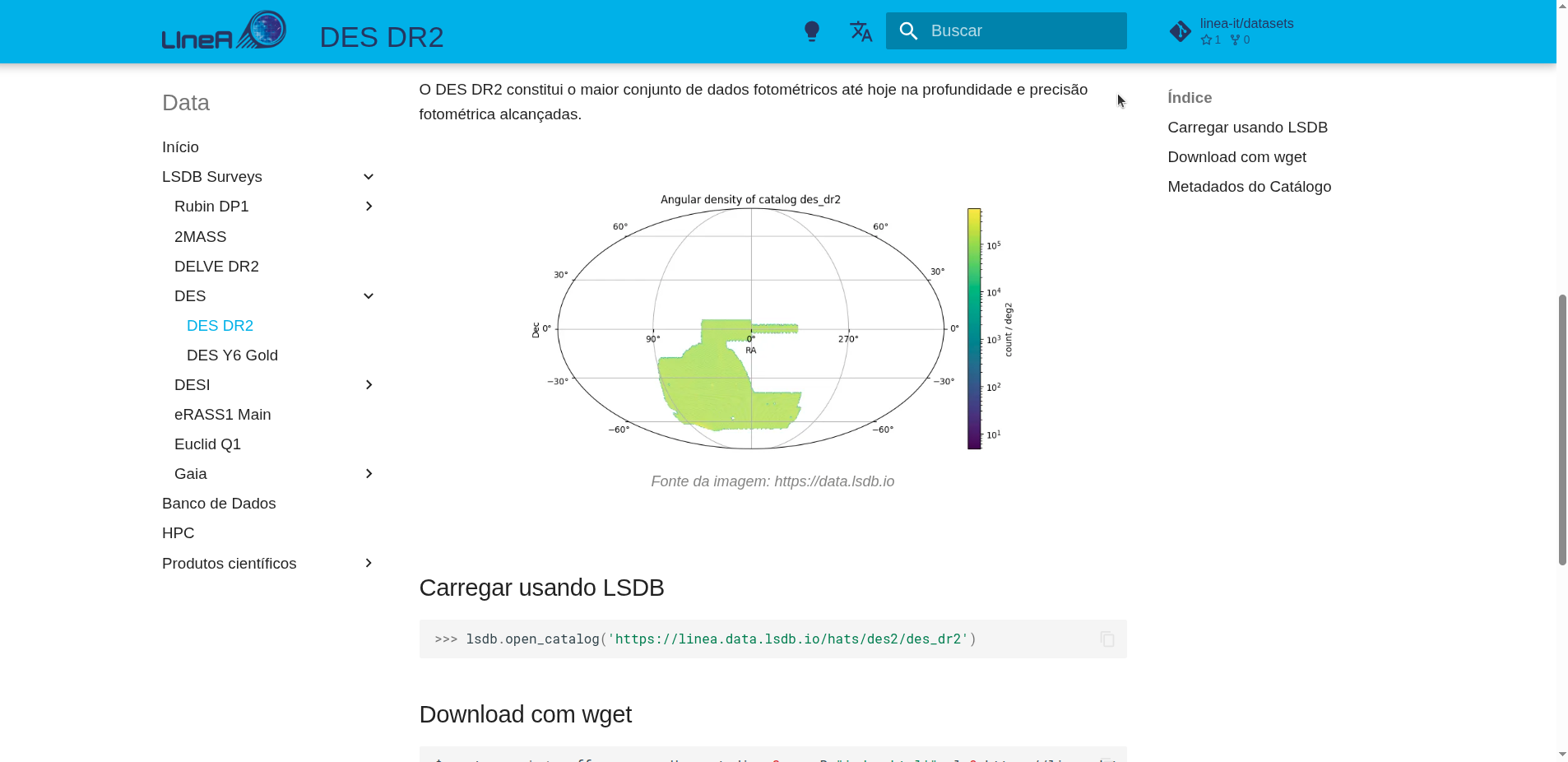 Todo o acervo de dados hospedados no LIneA está documentado no site data.linea.org.br. Lá você encontrará informações relevantes sobre os conjuntos de dados, links para as respectivas publicações e sites dos levantamentos de origem, além de instruções de acesso através das plataformas científicas e APIs.